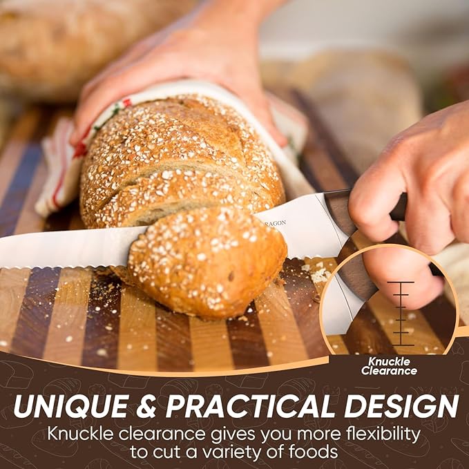 • Safety and Comfort: Designed for user safety, this bread knife features all-steel construction with an anti-fatigue blade curvature for a comfortable grip. The unique handle and blade height design enhance finger protection, making it ideal for daily use or as a thoughtful gift. Enjoy functionality and safety in one