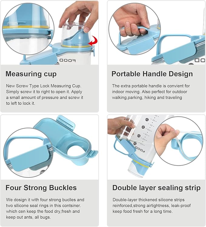 • Upgraded and Lmproved Versions:We have optimized and improved the mold the pour spout is large enough to pour out the big dog Food,You can pour out the food easy and fast now. The new upgraded Measuring Cup is also easy to screw on the spout now.The lid with snaps can also be easily closed on the barrel body.