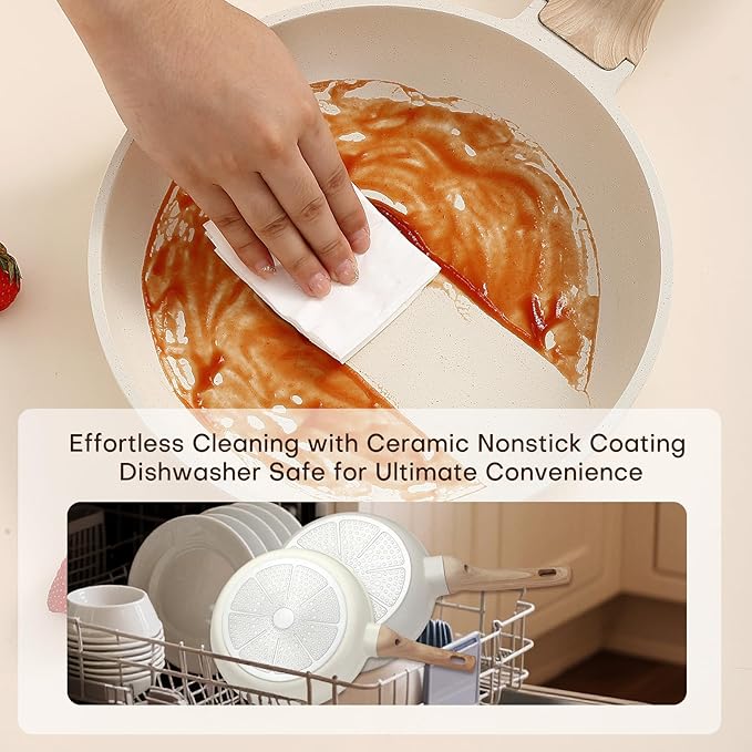 • Human Friendly Materials:Ceramic Cookware Set use Ceramic non-stick surface,The die cast aluminum structure ensures durability and lightweight, making it easier for you to cook ingredients better.nonstick coating ensuring easy food release and effortless cleanup.