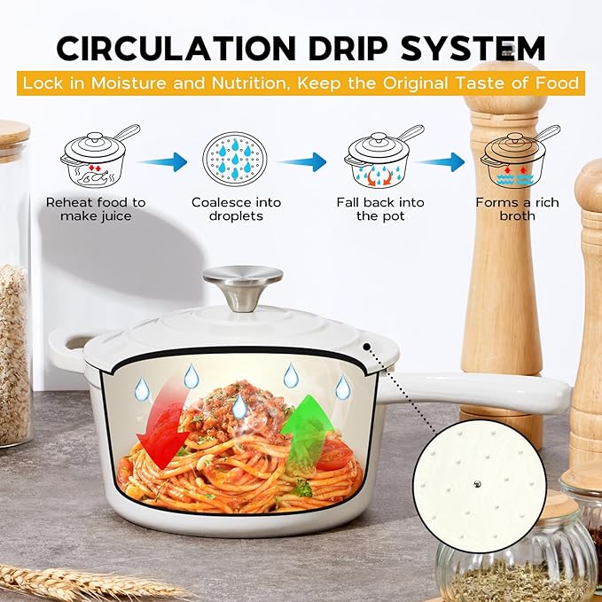 • Self Basting Lid: the raised dots underneath the lid collect condensed steam or broth and redirect it back onto the food, preserve the natural flavors and make food juicy, no seasoning required