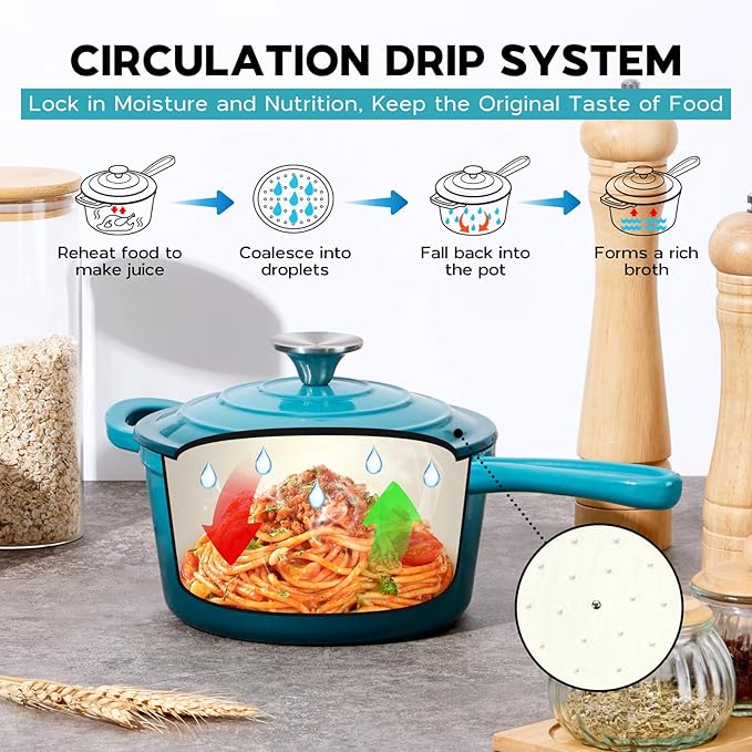 • Self Basting Lid: the raised dots underneath the lid collect condensed steam or broth and redirect it back onto the food, preserve the natural flavors and make food juicy, no seasoning required