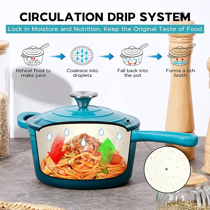 • Self Basting Lid: the raised dots underneath the lid collect condensed steam or broth and redirect it back onto the food, preserve the natural flavors and make food juicy, no seasoning required