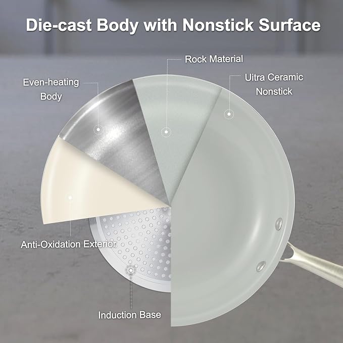 • 【Healthy Ceramic Nonstick 】The non-stick cookware set is made with a long-lasting, high-quality ceramic nonstick coating that makes the pots and pans set durable and cleaning a breeze.100% PTFE/PFOA/Lead/Cadmium free. The non-toxic cookware set allows you to cook healthily and safely, use it with peace of mind and eat your food with confidence