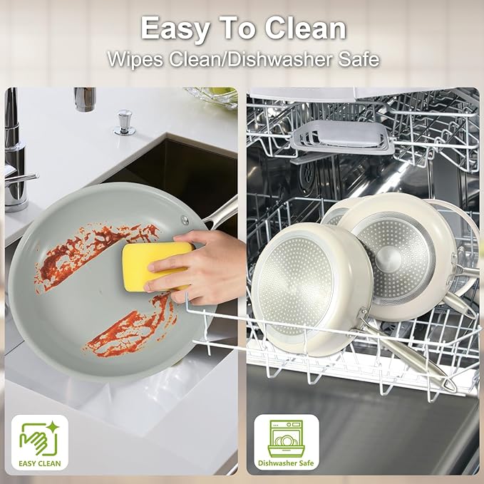 • 【Beautiful Pots and Pans Set】PRAMEDIA ceramic cookware set is beautifully designed for everyday cooking. The color of the pots and pans are glossy and textured, and the inside of the pot is smooth and scratch-free. The pots and pans set comes with a beautiful gift box, making it the perfect choice for house warm gift and home use