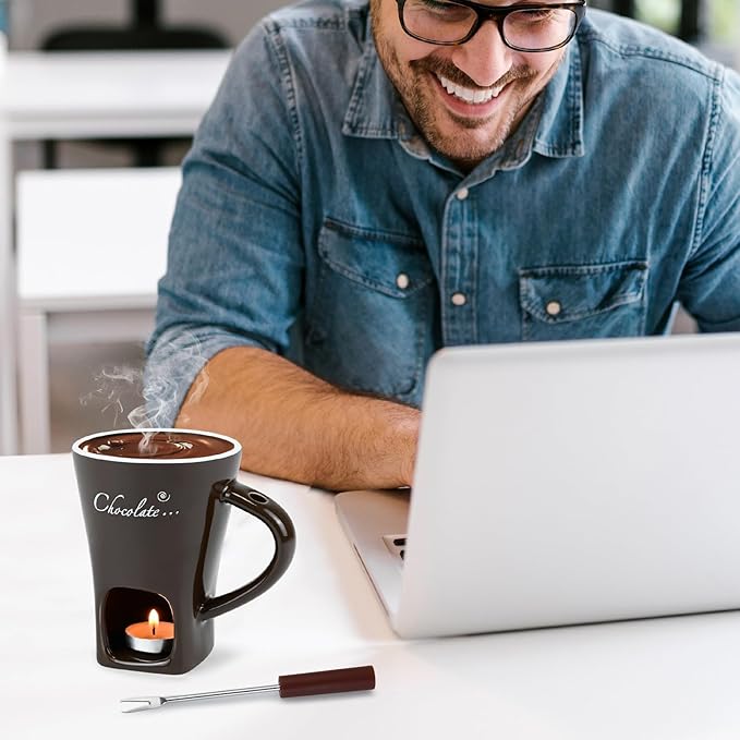 Sweet Fondue Cup for Chocolate Cheese Candy Butter - Chocolate Fondue Mug with Fork & 4 Candle, Mini Ceramic Chocolate Melting Cup, Personal Chocolate Melting Pot for Date Night Birthday (Coffee)
