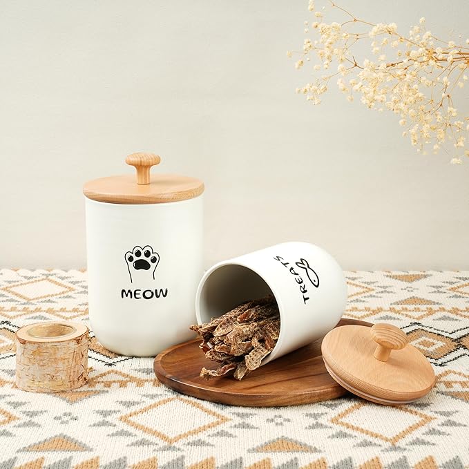 • Airtight Wooden Lids for Freshness – Equipped with airtight lids and stylish wooden tops, these cat treat jars for kitchen counter effectively block air and moisture, keeping your pet's treats fresh and crunchy. No more worries about stale or spoiled snacks—every bite stays delicious!