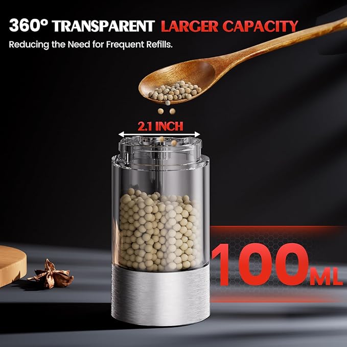 • 【Large See-Through Container 】– Fewer Refills, More Convenience. The spacious 360° transparent container lets you monitor spice levels at a glance. Lightweight and travel-friendly, it's a must-have for gatherings, camping trips, and outdoor meals