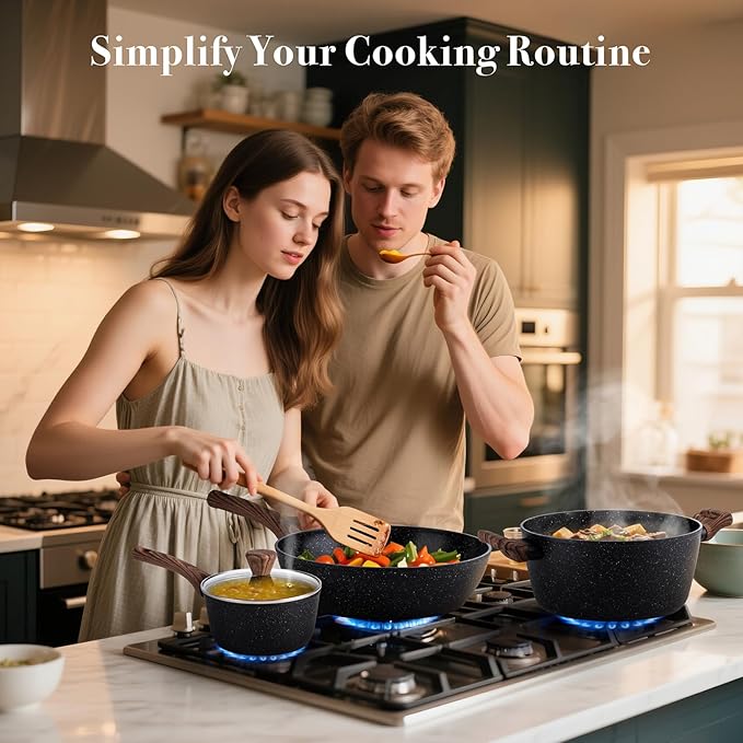 - Compatible with All Stovetops: The cooking set works on gas, electric, ceramic, and induction cooktops, with a stainless steel base that heats quickly and evenly—no hot spots, just consistent results.