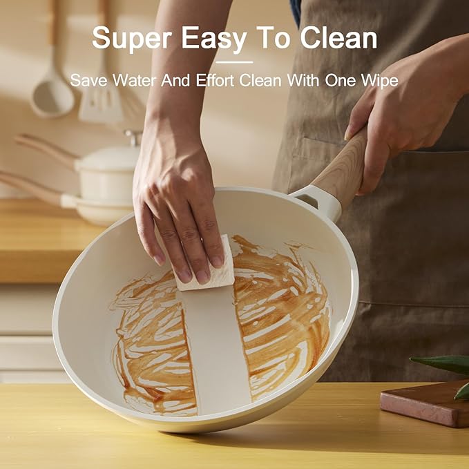 • 【Effortless Cleaning – No Sticking, No Scrubbing】Our ceramic cookware cleans up in seconds—simply rinse or wipe with a sponge. Hand wash is recommended to maintain coating longevity