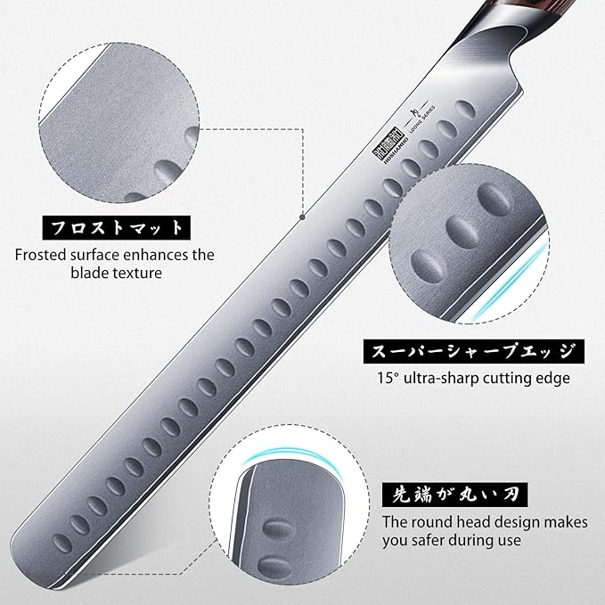 • 【Japanese Premium Steel】Brisket slicing knife sets is forged from 10Cr15CoMoV Japanese high-carbon steel, significantly enhancing hardness. Prevents blade fractures during use, enabling exceptional performance in high-intensity cutting tasks.