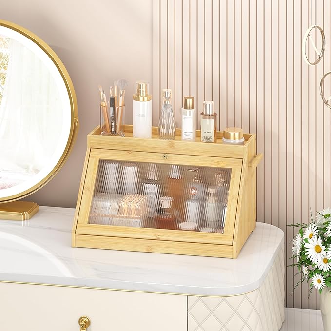 Bamboo Bread Box with Shelf for Kitchen Counter-Large Capacity Bread Storage Container with Wavy Arcylic Transparent Door Bamboo Wooden Farmhouse Bread Box for Your House (Nature)