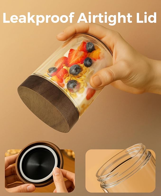 • Leakproof Acacia Lid: The unique designed acacia wood lid looks elegant and adds a nice aesthetic touch to your kitchen storage. The thick silicone ring makes these mason jars leakproof, so you don't have to worry about it spilling in your bag, which making them easy to take on-the-go and eat in the office.