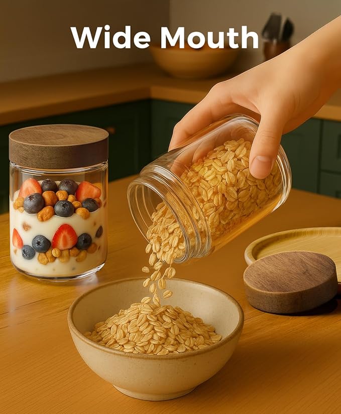 8 Pack 16oz Overnight Oats Containers with Lids, Glass Mason Jars with Acacia Wood Airtight Lids, Wide Mouth Meal Prep Storage Jars for Yogurt, Chia Pudding, Salad, Snacks, Spice