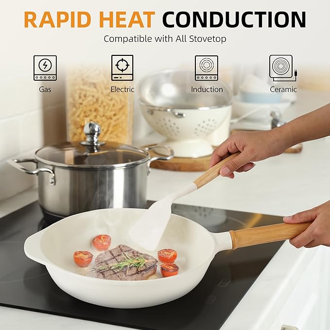 • NONSTICK FRYING PAN: The ceramic surface is smooth and nonstick, eggs can just slide right off the pan without effort. This skillet makes cooking easier and your food is much more flavorable with less oil!