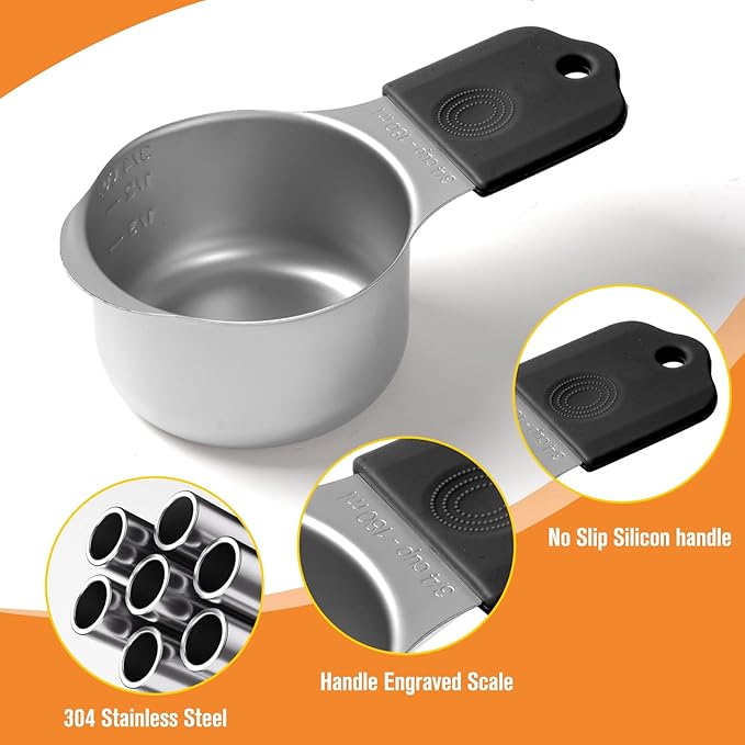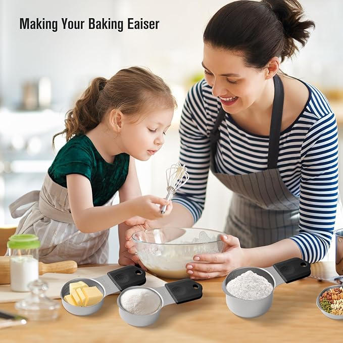 • Magnetic measuring cups set:Double-sided magnetic stainless steel measuring cup design of silicone fingerprint anti-slip particle handle, feel comfortable, anti-slip, easy to grip.This measuring cups set includes :1 cup, 3/4 cup, 2/3 cup, 1/2 cup, 1/3 cup, 1/4 cup, 1/8 cup.