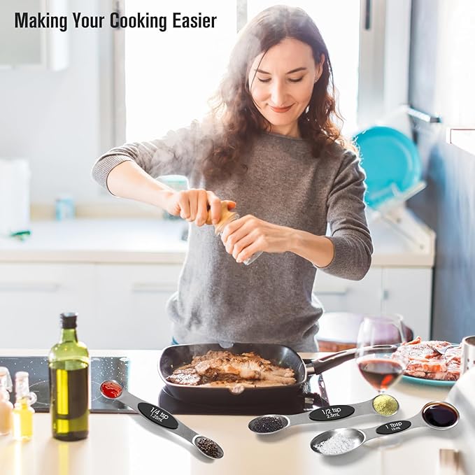 • Magnetic measuring spoons set: Double-sided magnetic stainless steel measuring spoon, round end is suitable for measuring liquids,they also lay flat on the table without spilling their contents. The oval end is suitable for measuring dry ingredients and fit into most spice jars. This measuring spoons set includes :1tbsp, 1/2tbsp, 1tsp, 3/4tsp, 1/2tsp, 1/4tsp, 1/8tsp, 1/16tsp, plus leveler.