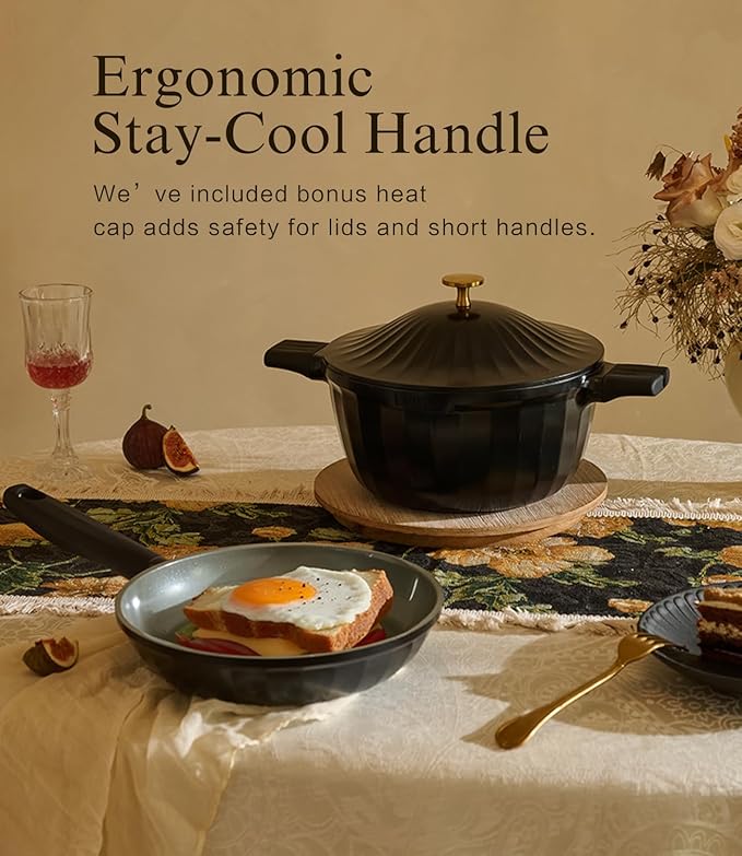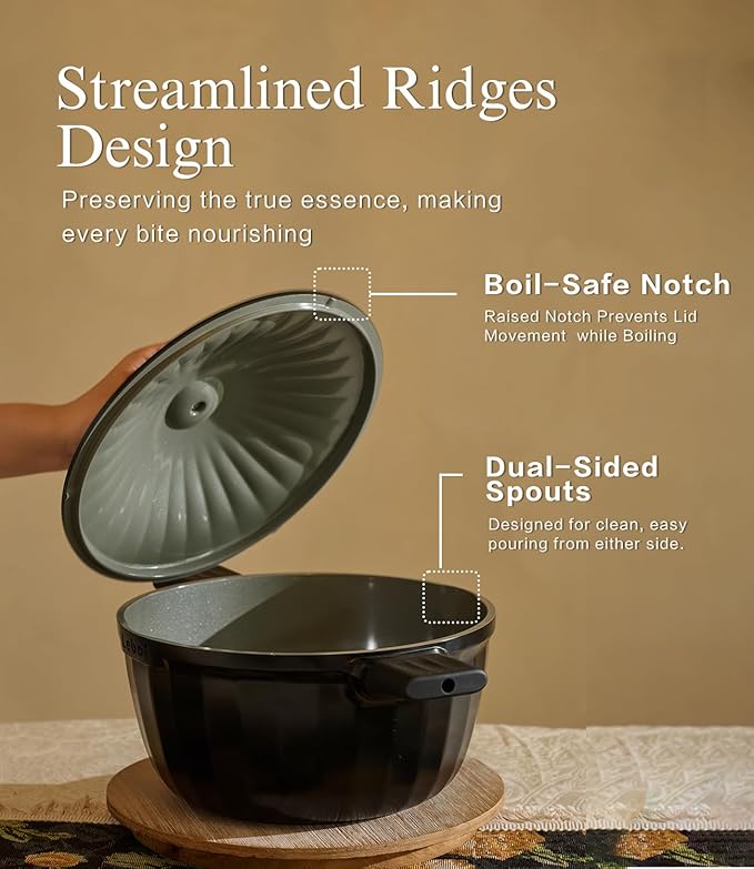 • Thoughtful Design for Everyday Ease: From streamlined ridges that lock in flavor to a raised notch that keeps the lid steady while boiling—every design choice serves a purpose. Dual-sided spouts make pouring easy from either side, and the stay-cool handle with heat cap adds comfort and safety.