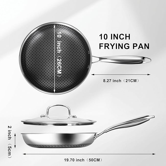 10 Inch Nonstick Frying Pan with Lid, Stainless Steel Skillet with Honeycomb Surface, Induction Compatible, Oven & Dishwasher Safe, PFAS-Free Cookware