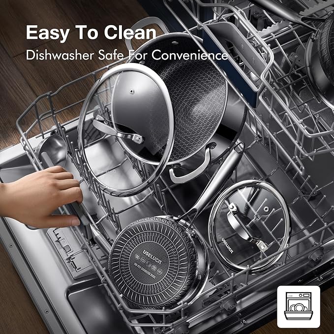 - [EASY TO CLEAN & COOKING]: To maintain the quality of your cookware and extend the lifespan of the domestic coating, use wooden or silicone spatulas to protect the coating. When cleaning, allow the cookware to cool completely to room temperature before washing with dish soap and a sponge or other soft material. This product is dishwasher safe.