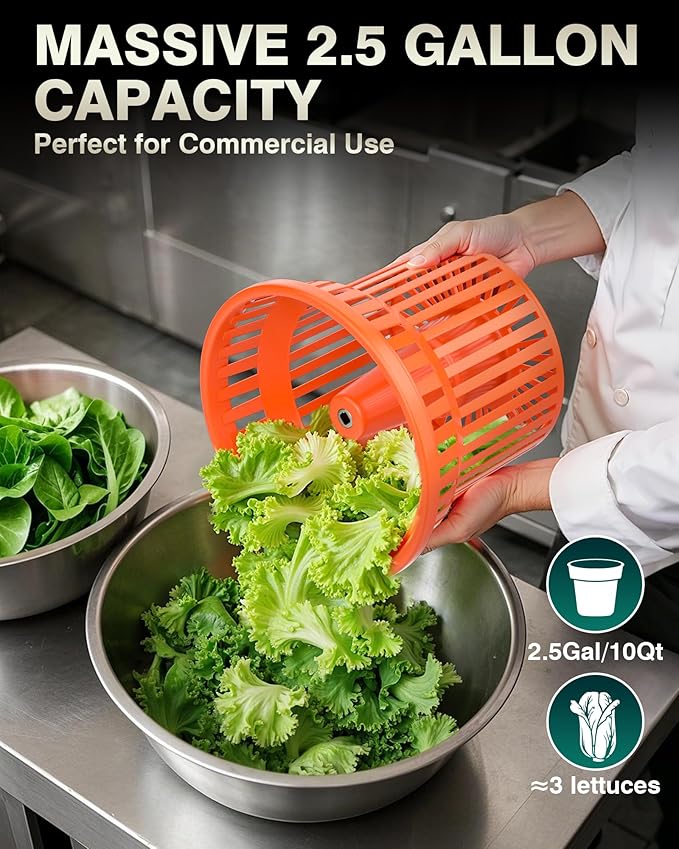 • LARGE CAPACITY: With a 2.5-gallon basket, our big salad spinner can handle up to three heads of lettuce in one spin. Quickly dry your vegetables and maintain the fresh taste of your salad. Ideal for those who need a salad spinner 2.5 gallon for commercial or home use.