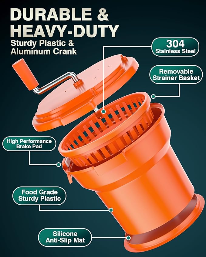 • DURABLE DESIGN: Built to last, our commercial salad spinner is constructed with a sturdy plastic body and durable stainless steel crank and gears. This kitchen tool is designed for long-term use, making it a reliable addition to your kitchen arsenal. Say goodbye to frequent replacements with our long-lasting lettuce spinner large.