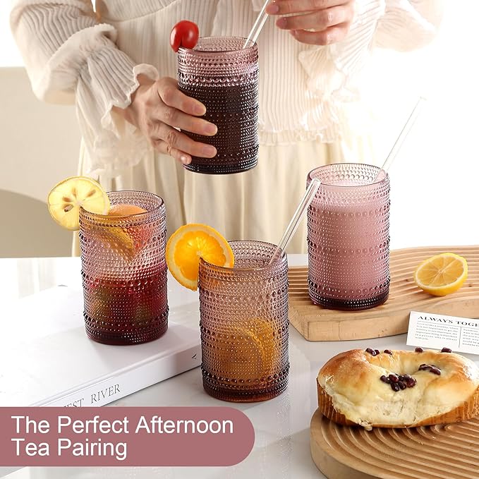• PACKAGE DETAILS: includes 4 pcs 12oz vintage hobnail drinking glasses,4 pcs 15oz vintage hobnail drinking glasses,4 pcs glass straws, 1 pcs straw cleaning brush, 1 pcs cup cleaning brush