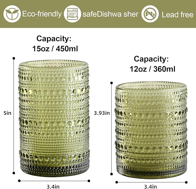 Vintage Hobnail Drinking Glasses Set of 8,Colored 12 oz & 15oz Highball Glass Cups, Kitchen Drinkware Glassware,Embossed Water Tumbler,for Beer,Cocktail,Whiskey,Juice and Various Mixed Drinks