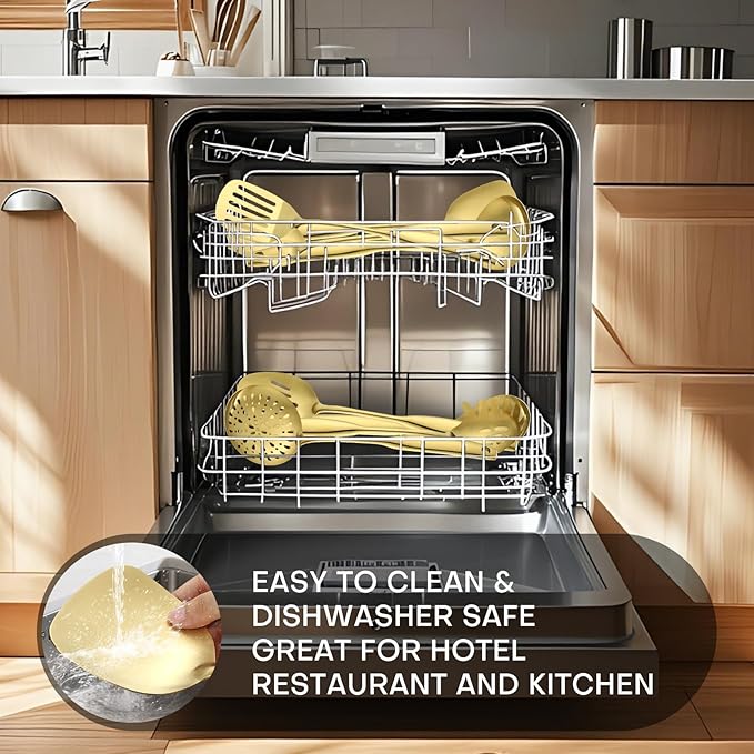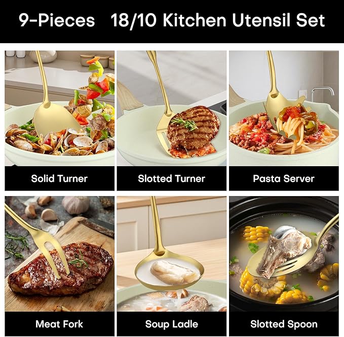 • Complete 9-Piece Kitchen Essentials – Includes solid spoon, slotted spoon, turner, spatula, pasta spoon, ladle, and more – all you need for cooking, frying, baking, and serving.