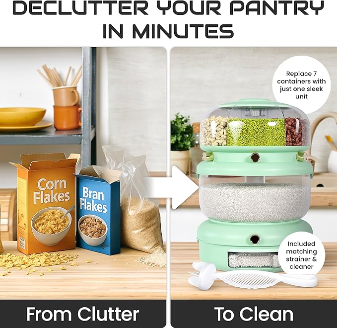 • POUR OUT GRAINS INSTANTLY with our Rice Storage Container. Its 6 individual holders let you neatly sort rice, beans, and more. This rice bin is not just for food — it also keeps your pet’s kibble, treats, or even laundry detergent well-organized