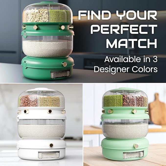 Rice & Multi-Grain Dispenser – Airtight 3-in-1 Rotating Food Storage with Strainer, Holds Up to 22 lbs (12 lb Bulk + 6 Compartments)