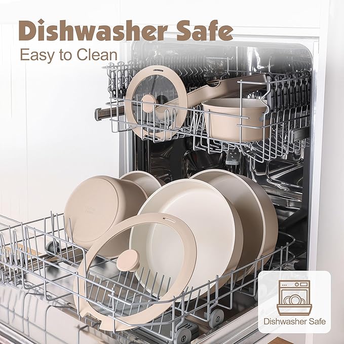 • Dishwasher Safe - Cleaning is a breeze. Professional wear-resistant design for the bottom of the pan set that prevents black residue even when used in the dishwasher.