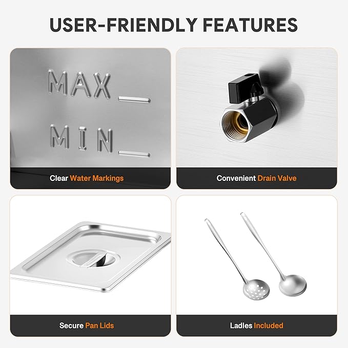 • Rapid & Even Heating: The 1500W U-shaped heating tubes, made from 304 stainless steel, heat up fast and distribute warmth evenly. With our adjustable range of 86 to 185°F, you can keep sauces smooth, sides warm, and meats juicy for perfect serving