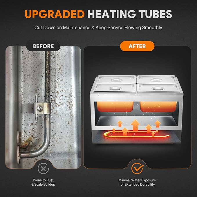 • Enhanced Safety: The hidden heating tubes and repositioned thermostat stay completely dry to prevent leaks, rust, and scaling. With an automatic shutoff at 356°F, your food stays protected while your warmer for food runs safely