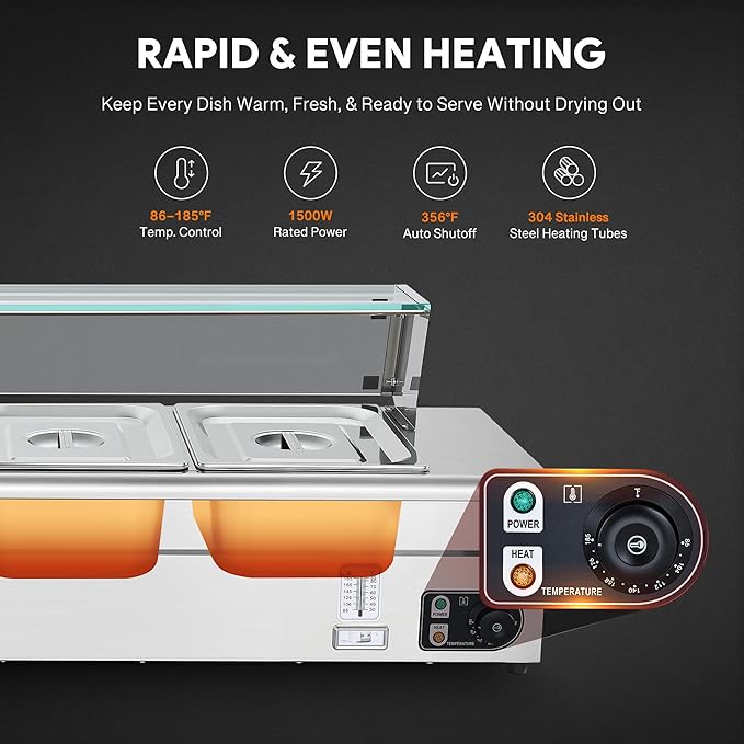 • Rapid & Even Heating: Our 1500W U-shaped heating tubes, made from 304 stainless steel, heat up fast and distribute warmth evenly. With our adjustable range of 86 to 185°F, you can keep sauces smooth, sides warm, and meats juicy