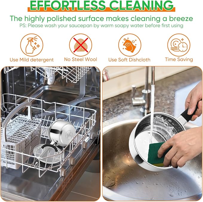 - 【Premium & Lightweight】The 1qt saucepan body is made of premium stainless steel with no any coatings, No worries about coatings falling out or peeling into your food during use, Non-toxic material ensures the food-grade and healthy cooking, The stainless steel sauce pan is designed 1-layer stainless steel and 3-layer bottom, which could no only ensure its high performance and but also offer a light weight for your comfortable to use, Sturdy construction for lasting use