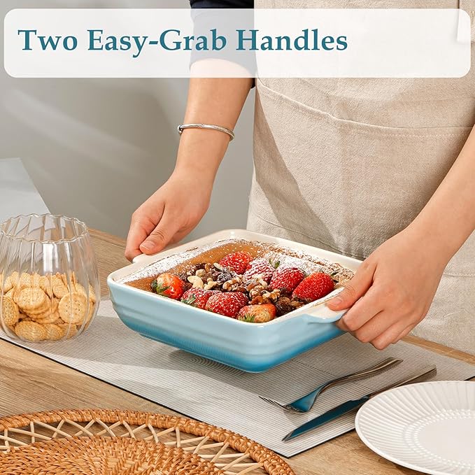 NUTRIUPS 8x8x2.4 inch Square Baking Dish, 50 Oz /1.6 Qt Ceramic Baking Pan with Handles, Casserole Dish for Oven, Porcelain Bakeware (Gradient Blue)
