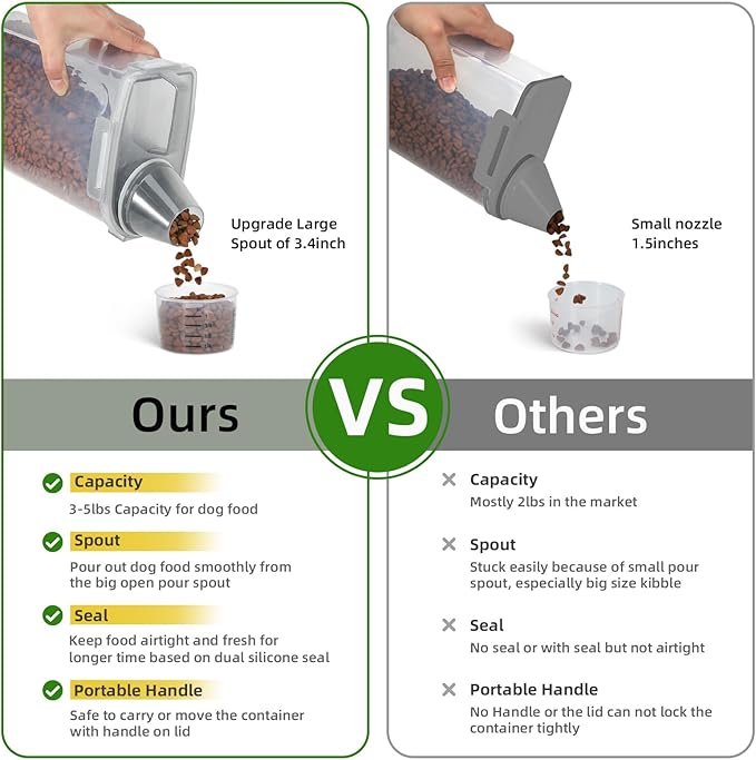 • FRESH SEALED CONTAINER:The dog food container is double-sealed with press-type snaps and silicone sealing gasket. The slot design keeps the food from moisture. There are four snaps on the side of the sealing cover, which provides excellent sealing and ensures Food freshness and freedom from moisture, dust and pests.
