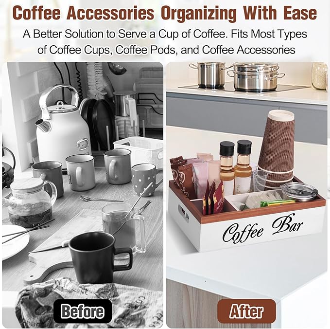 - 【Great Coffee Station Gifts】Crafted from premium, eco-friendly solid wood, this coffee holder features a thoughtful design that truly stands out. It neatly organizes coffee cups, creamers, tea packets, sugar packets, pods, stirrers, and more—all while saving valuable space and keeping your countertop tidy. Our team proudly stands behind the product with a 1-year warranty. If you experience any issues, please reach out—our friendly support team is always here to help.