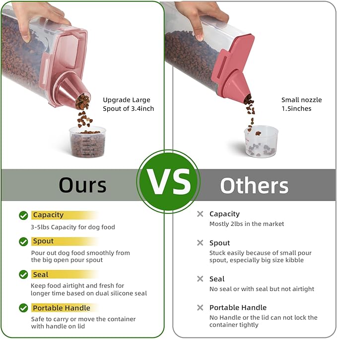 • Upgraded and Lmproved Versions:We have optimized and improved the mold the pour spout is large enough to pour out the big dog Food,You can pour out the food easy and fast now. The new upgraded Measuring Cup is also easy to screw on the spout now.The lid with snaps can also be easily closed on the barrel body.