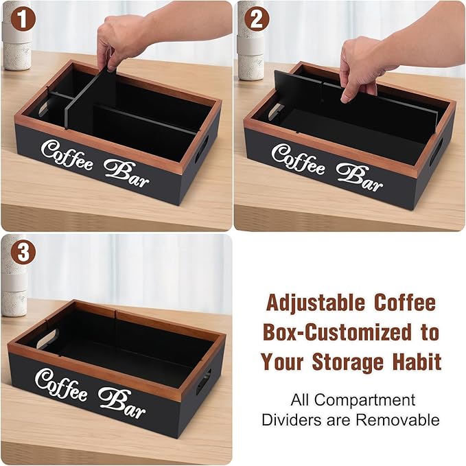 - 【Removable Dividers+ 4 Large Compartments】This coffee organizer features four compartments with removable dividers, allowing you to customize the layout to suit your needs. Easily organize all your coffee essentials in one convenient, tidy space. We've also thoughtfully sized each of the 4 compartments based on typical coffee usage frequency. For example, you can place coffee stirrers or napkins in 2 smaller sections, while coffee tools, coffee, syrup accessories neatly into the larger sections.