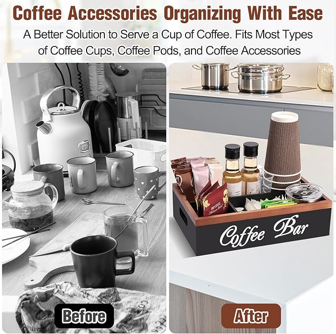 - 【Great Coffee Station Gifts】Crafted from premium, eco-friendly solid wood, this coffee holder features a thoughtful design that truly stands out. It neatly organizes coffee cups, creamers, tea packets, sugar packets, pods, stirrers, and more—all while saving valuable space and keeping your countertop tidy. Our team proudly stands behind the product with a 1-year warranty. If you experience any issues, please reach out—our friendly support team is always here to help.