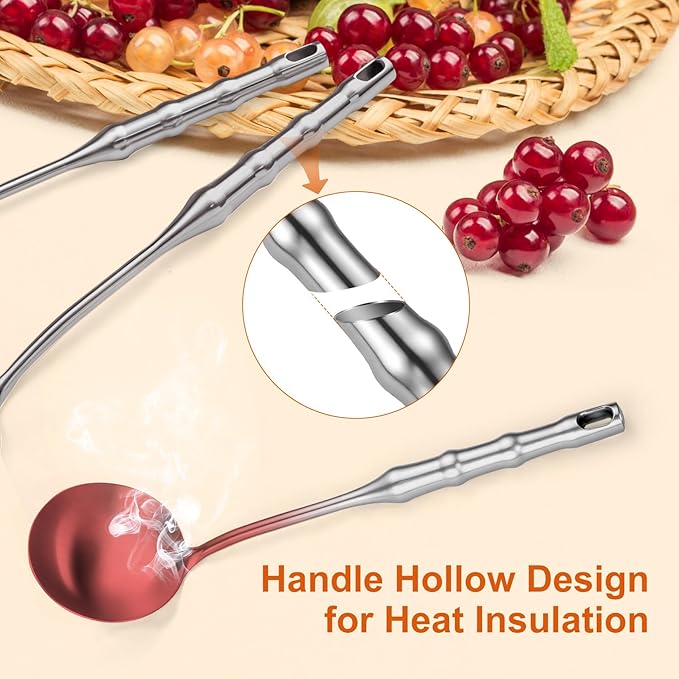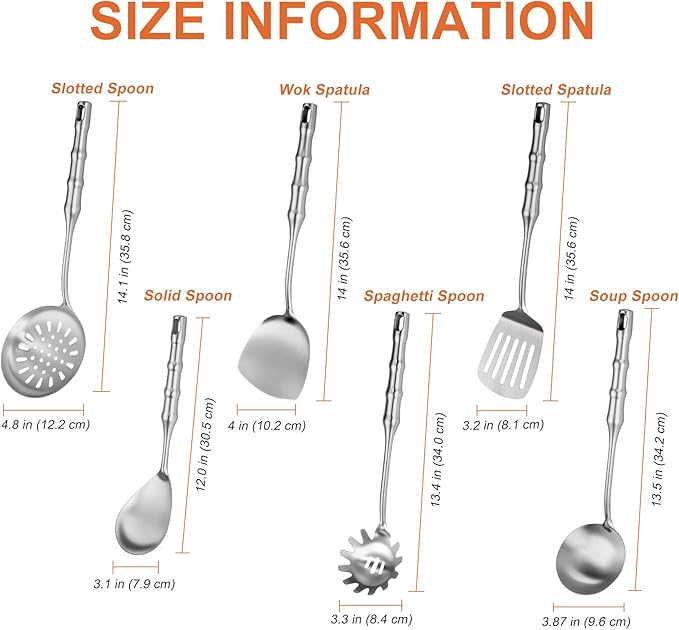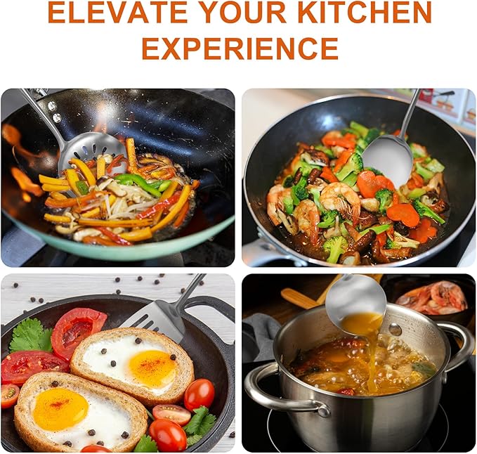 • ERGONOMIC & PRECISE DESIGN: Cook like a pro with this metal cooking utensils set! Each utensil is designed for ergonomic comfort and functional efficiency. The wok spatula and slotted spoon are perfect for flipping and draining, while the solid spoon and ladle help with portioning, making the stainless steel cooking utensils a must-have​