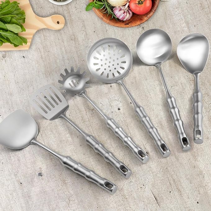 • COMPLETE 6-PIECE SET: Get all your cooking needs covered with this 304 stainless steel cooking utensils! It includes 1 wok spatula, 1 soup spoon, 1 slotted spatula, 1 slotted spoon, 1 spaghetti spoon, and 1 solid spoon. Whether you’re making a quick meal or a feast, this metal cooking utensils set has the perfect tool for every task​