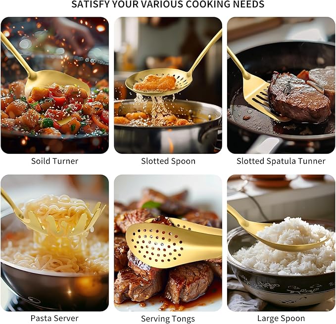 • Unique And Stylish Elegant Design: Our kitchen cooking utensils set features a unique curved design, fashionable and exquisite, with smooth mirror-like edges, elegant appearance and unique style, giving your kitchen the finishing touch