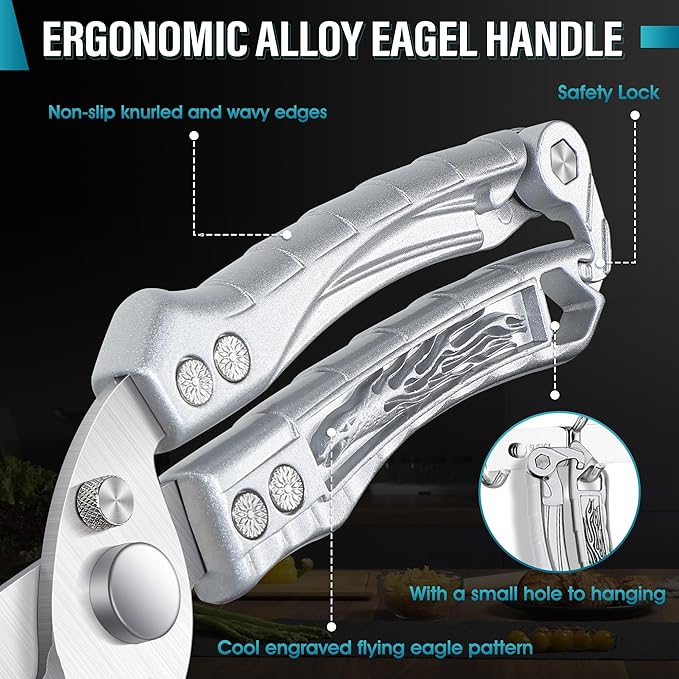 • ERGONOMIC FLYING EAGLE HANDLE - The pretty silver alloy handle with a cool flying eagle pattern design will never fade and rust. The four rivets hold the handle and the blades firmly. The Nonslip wavy edge creates a safe and comfortable grip, they won’t slip out of your hands while you’re using them. The hanging hole on the tail helps you save room, and store it.