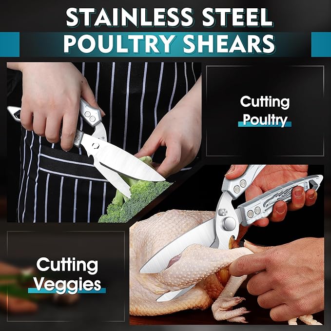 • HEAVY-DUTY SHARP BLADE - The heavy duty Stainless steel kitchen poultry shears are anti-rust, dishwasher safe, and very easy to clean and maintain. The durable sharp blade is perfect for cutting fresh and fried food. The bottle opener in the blade can open bottles and jars effortlessly. One blade has micro-serrated blade edges to help you cut poultry and other food without slipping. Round tips will protect the skin well.