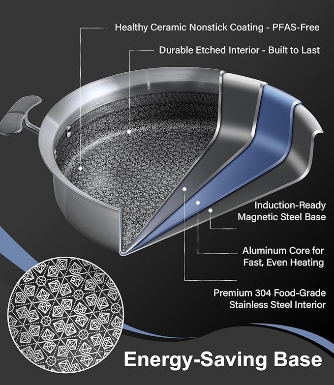 • ENERGY-SAVING BASE & INDUCTION COMPATIBLE :The ECO-EFFICIENT TRI-PLY BASE distributes heat evenly for faster cooking and less energy waste. Works perfectly on all stovetops, including INDUCTION, electric, and gas.