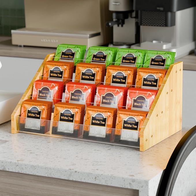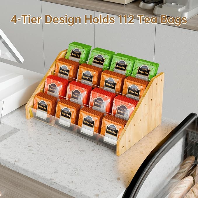NiHome 4 Layer Tea Bag Organizer, Bamboo & Plastic Tea Storage Holder Organizer, 4-Tier Design Offering Quick and Easy Access, Clear Dividers & Large Capacity, Easy to Assembly