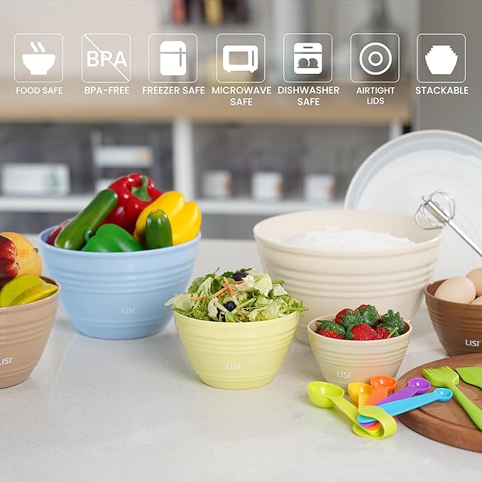 LISI 6 Pack Mixing Bowl Set with Lids, Plastic Bowls for Kitchen, Nesting Salad & Meal Prep Bowls, BPA-Free, Large Storage Bowl with Airtight Lids