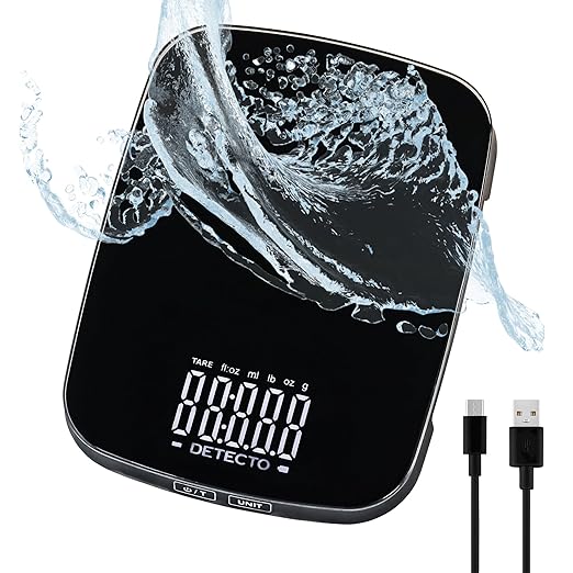 DETECTO Digital Kitchen Scale, Highly Accurate, Compact Glass Platform, Easy-to-Read Display, USB Rechargeable, 22 lb Capacity, Black/White (Black)